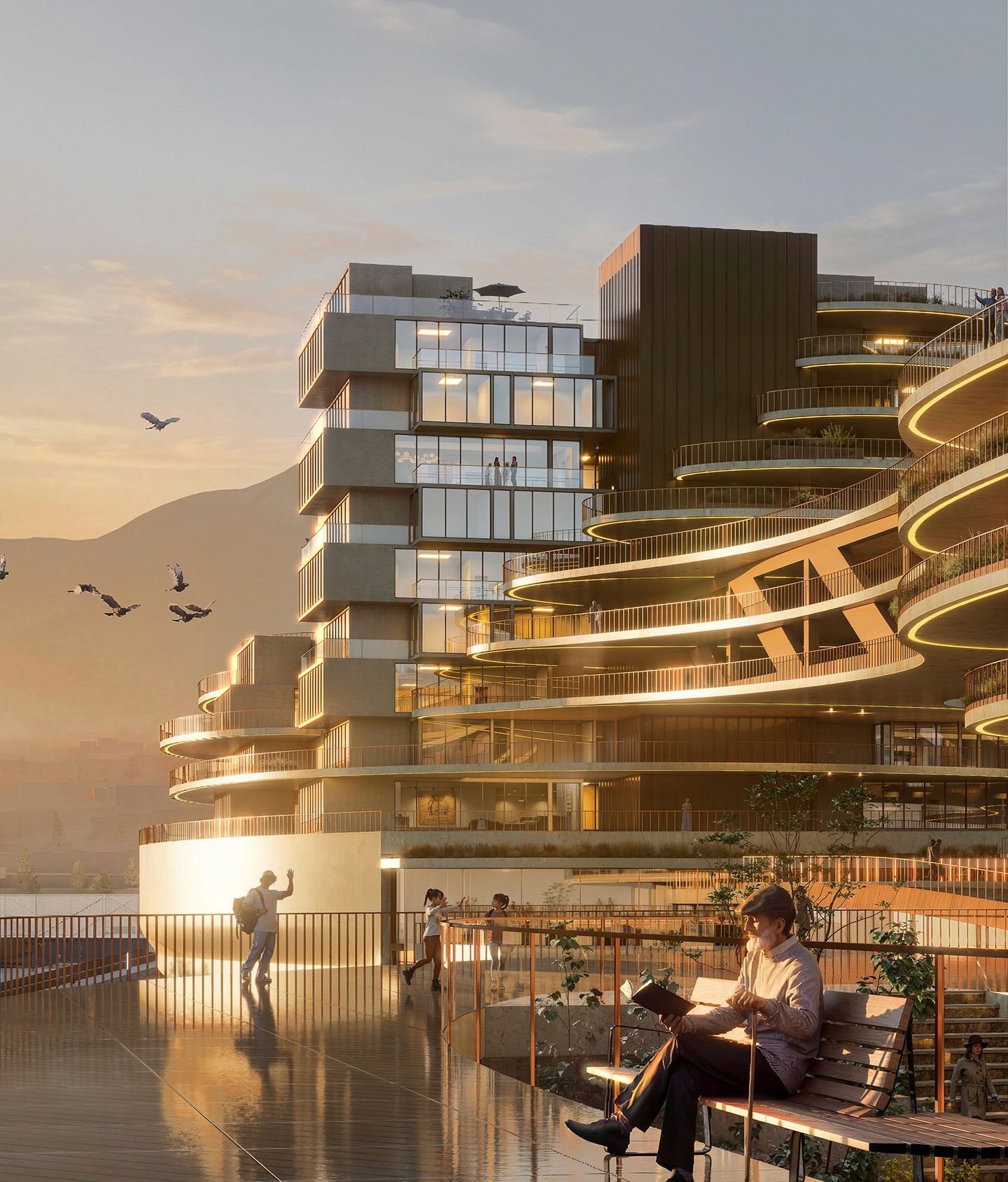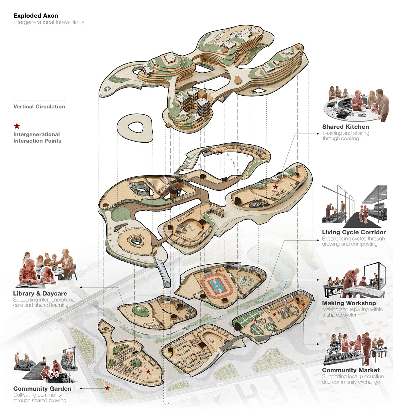 This project imagines an open multigenerational community that supports connection across ages through shared daily life, learning, and exchange. It combines productive landscapes, adaptable housing, and ecological infrastructure to create a more socially and environmentally connected living environment.