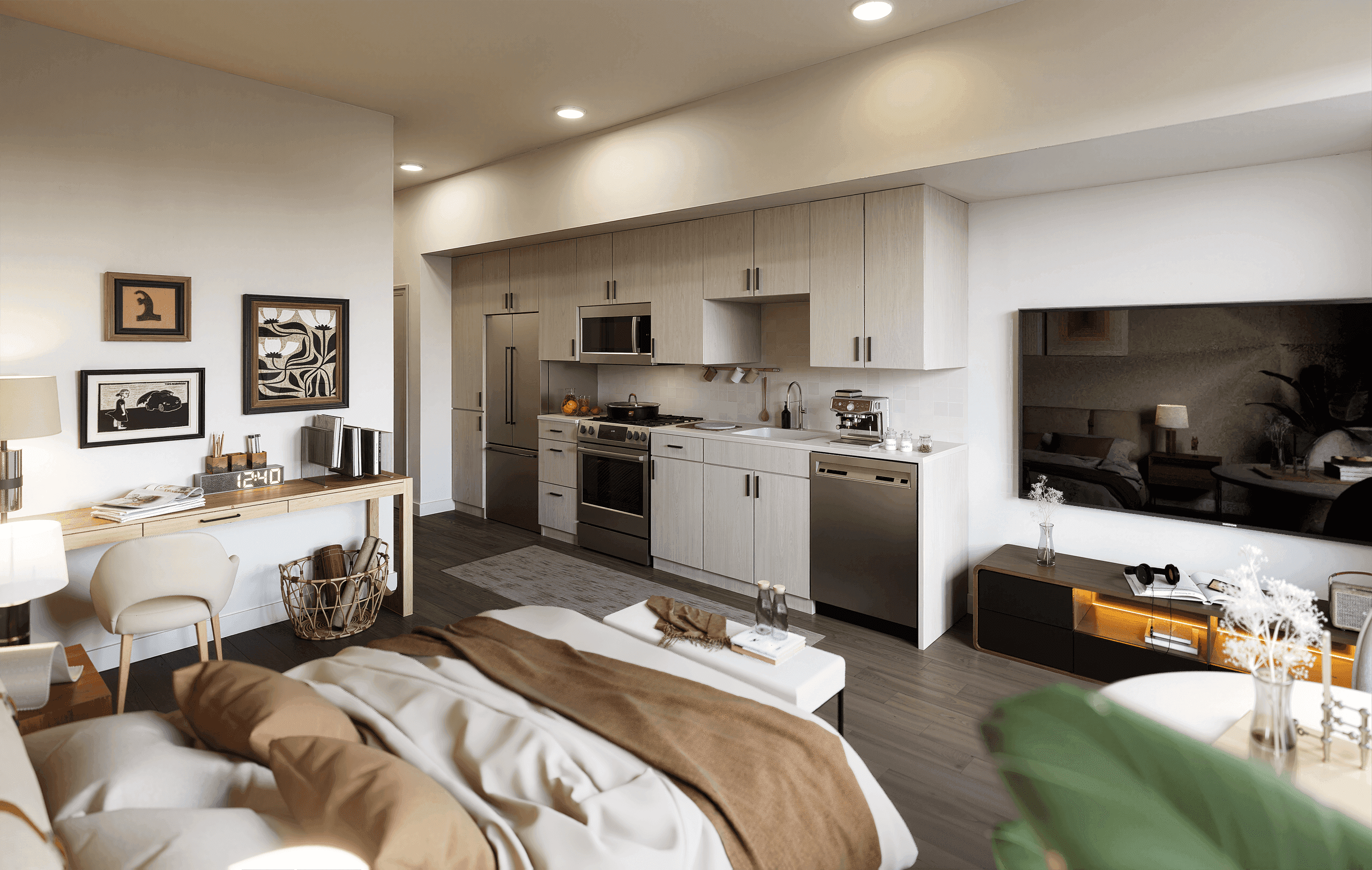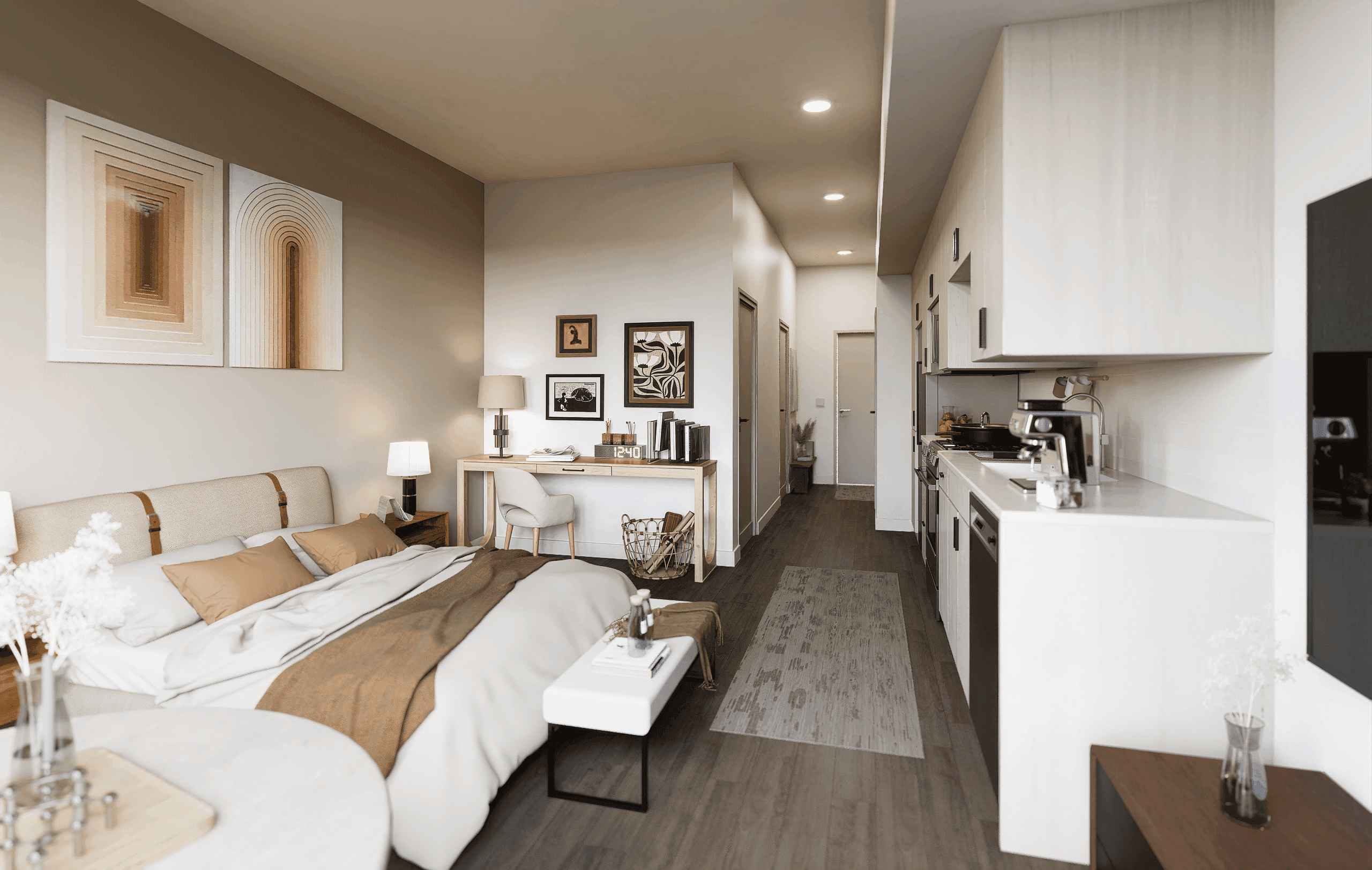 Based on the client’s construction documents, this project involved rebuilding multiple unit types in Rhino and rendering them in D5 according to the prescribed design language, appliance selections, and material schedules. The result is a set of interior visualizations that accurately translates technical documentation into presentation-ready spatial images.