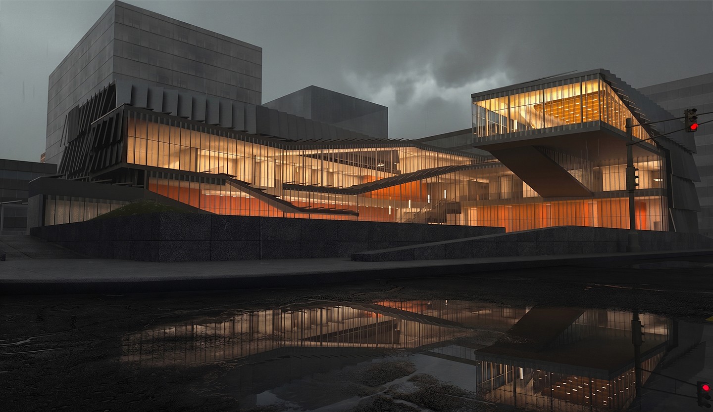 Based on floor plans, elevations, sections, and photographic references, this project reconstructed the Singh Center as a true-to-scale digital model and developed it into a series of renderings and animations. Extensive use of Cinema 4D effectors helped produce realistic visual effects, cinematic atmosphere, and animated façade transformations.