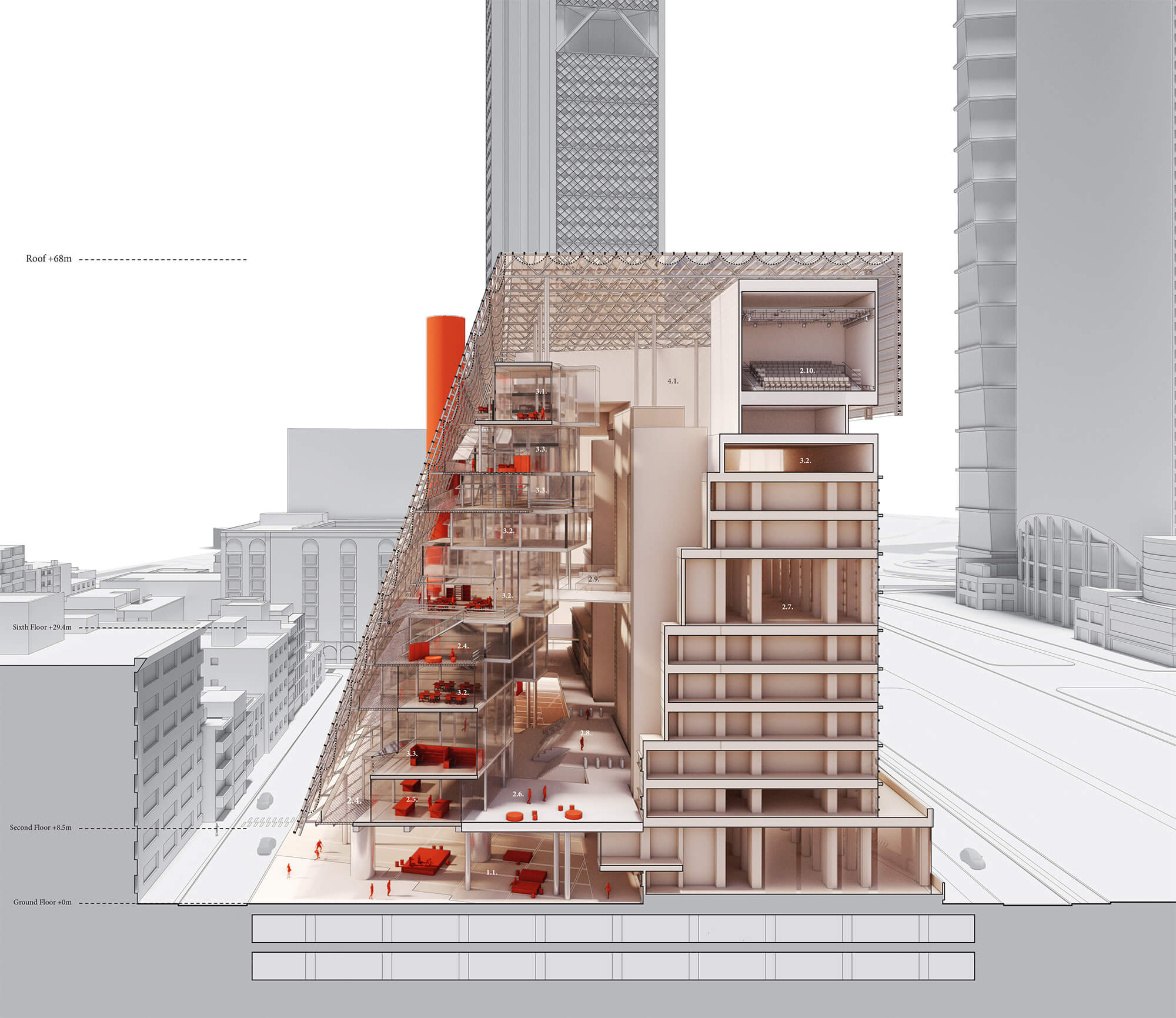 An adaptive reuse proposal in Mexico City that reimagines a design school as an extension of street life through cluster-based program organization.